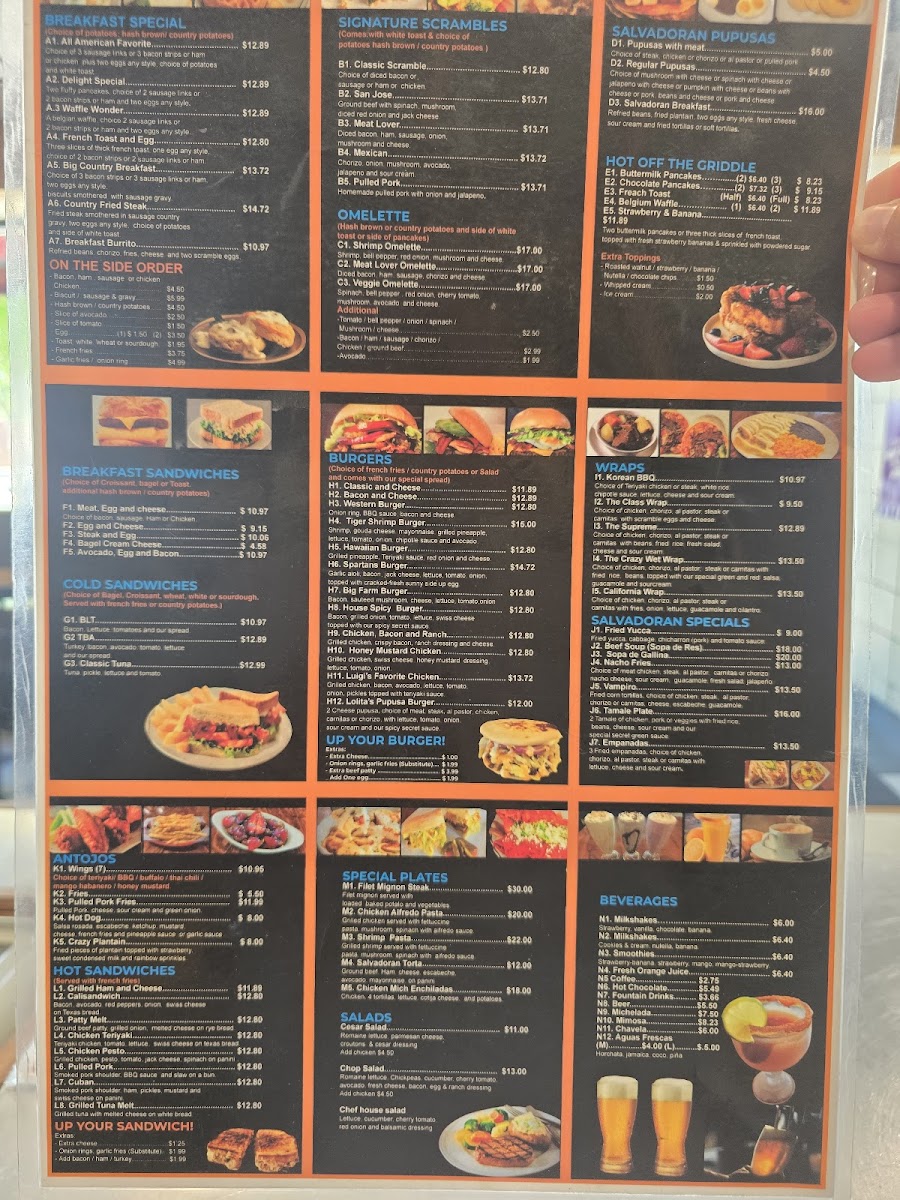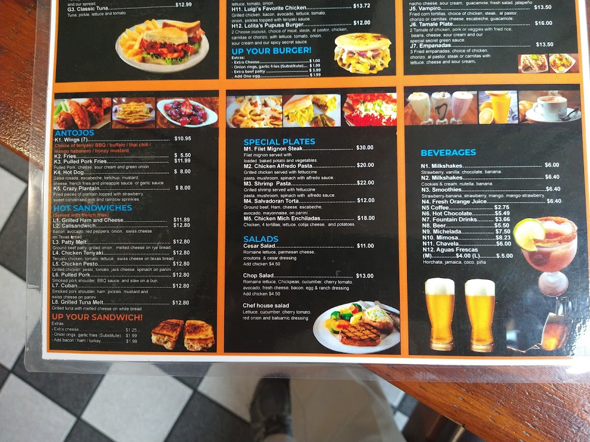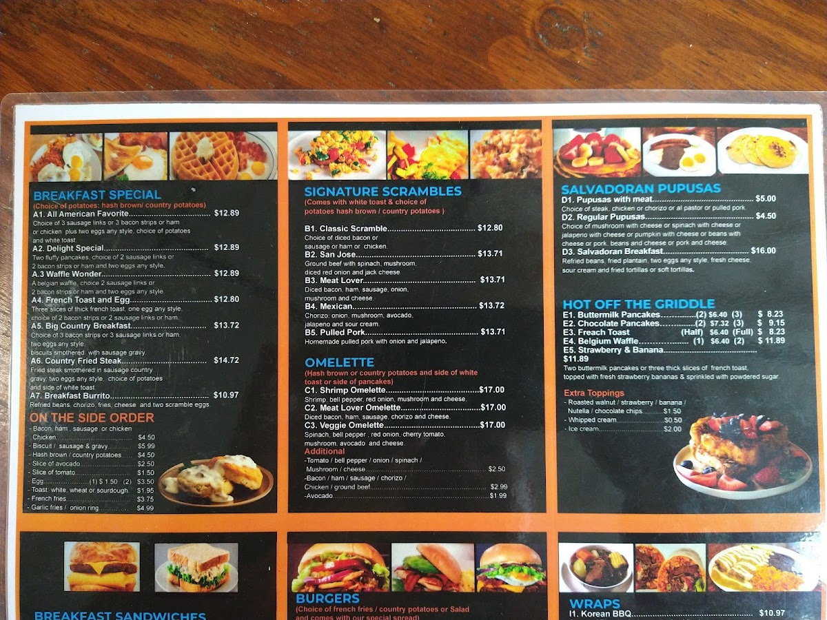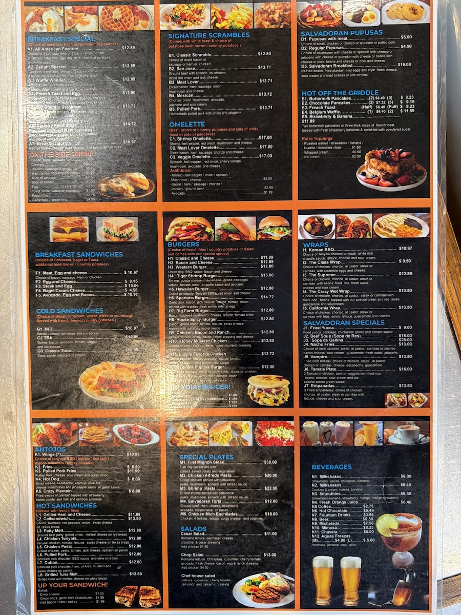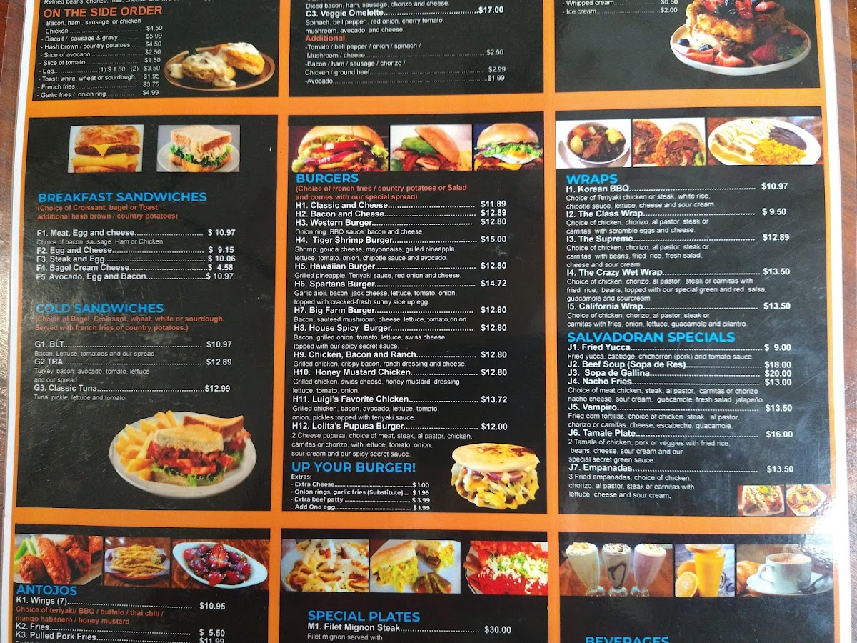 For those craving something different, the WRAPS section introduces options like the Korean BBQ Wrap at $9.99 or the California Wrap for $8.99. And don't forget to explore the Salvadoran Specials, where dishes like Fried Yucca and Beef Soup (Sopa de Res) bring a flavorful taste of El Salvador at affordable prices.